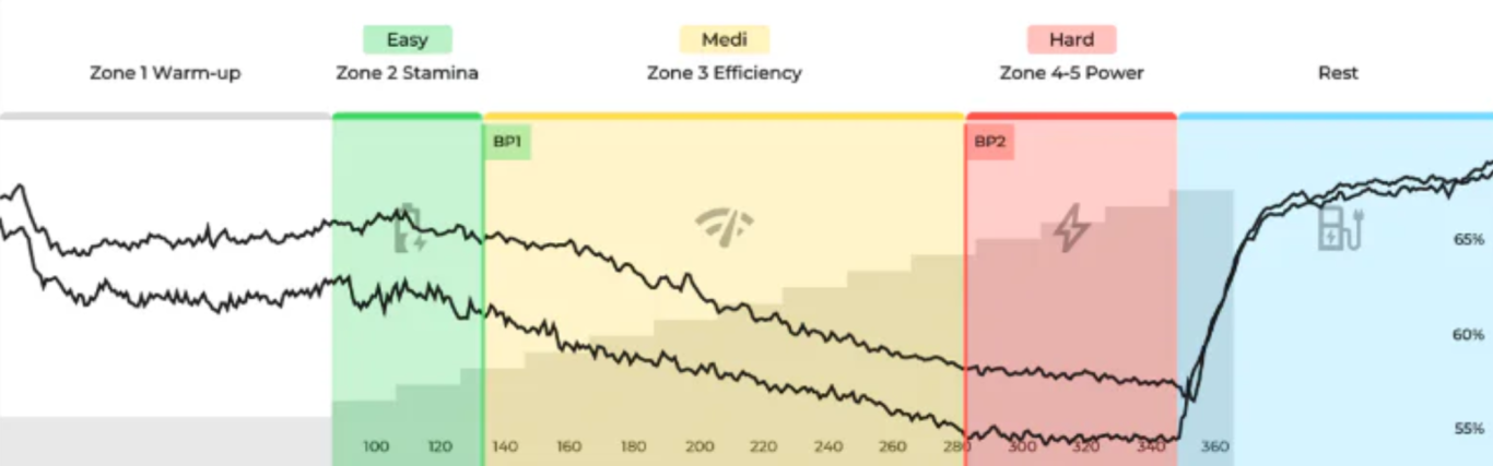 Mittels des Verlaufs sind Knickpunkte erkennbar, welche die Trainingszonen kennzeichnen.
