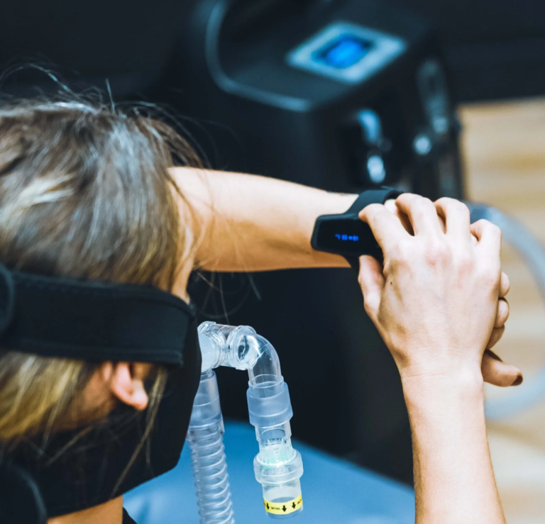 Du sitzt für 20 Minuten entspannt auf einem Stuhl und atmest simulierte Höhenluft über eine Maske ein.